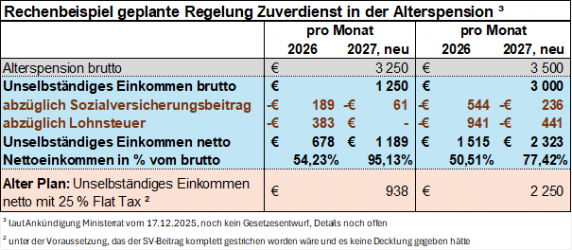 Eigentlich hätte die neue Regelung beim Zuverdienst in der Alterspension schon mit 1. Jänner 2026 in Kraft treten sollen. Doch erst im Dezember 2025 konnten sich die Regierungsparteien zu einem grundsätzlichen Kompromiss durchringen und wollen nun die gesetzlichen Grundlagen im ersten Quartal 2026 auf den Tisch legen und die Umsetzung mit Jänner 2027 verankern. Trotz der angespannten budgetären Lage fallen die nun kolportierten Regelungen günstiger als die ursprünglich im Regierungsprogramm vorgesehenen Maßnahmen aus. Wie immer steckt der Teufel im Detail und daher werden auch nicht alle Pensionisten einem begünstigten Zuverdienst nachgehen können. Wir haben für Sie das neue Regelwerk genau unter die Lupe genommen und Vergleichsrechnungen angestellt.